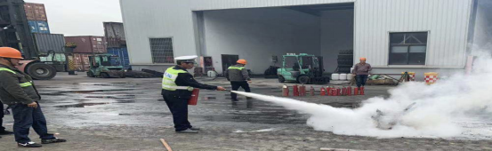 (圖345:員工們正在規(guī)范地使用滅火器滅火)