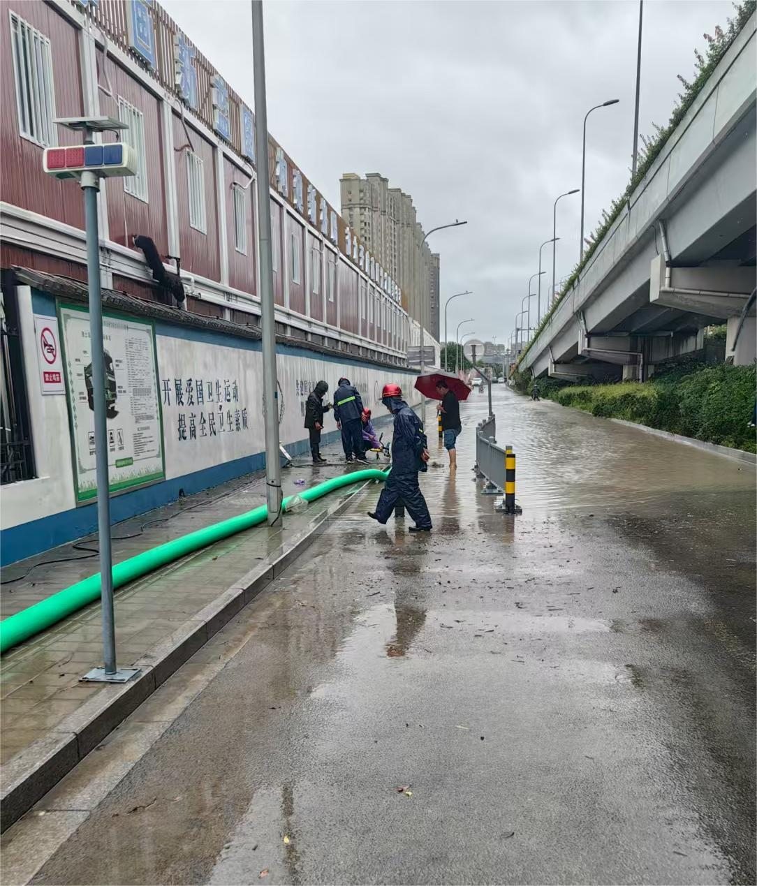 由大榮建設(shè)集團有限公司承建的YZ01-03-05-1、2地塊項目正在按響應(yīng)要求,緊張有序地組織人員轉(zhuǎn)移。隨著臺風(fēng)帶來的降雨影響越來越大,項目部門口環(huán)城南路附路積水慢慢升高,至上午6時許,該低洼路段積水最高水位達到70cm左右。危急時刻,項目負責(zé)人時峰接到金達社區(qū)林主任的緊急來電,告知積水對居民通行造成的嚴(yán)重影響。