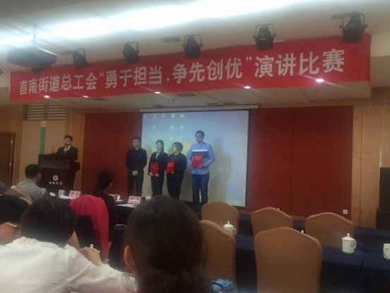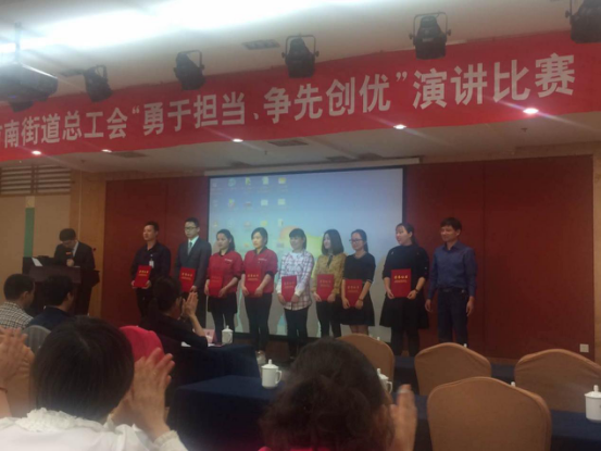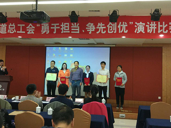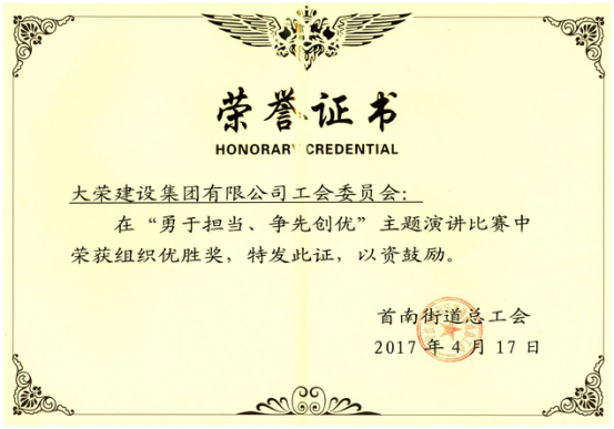 2017年4月17日下午,為進(jìn)一步培育和踐行社會(huì)主義核心價(jià)值觀,全面提高職工道德素養(yǎng),大力弘揚(yáng)“勇于擔(dān)當(dāng),爭(zhēng)先創(chuàng)優(yōu)”的勞動(dòng)精神,首南街道總工會(huì)舉辦主題為“勇于擔(dān)當(dāng),爭(zhēng)先創(chuàng)優(yōu)”職工演講比賽。大榮公司員工毛晨、張柳雅和費(fèi)陳三位同志參加了該比賽,其中毛晨榮獲三等獎(jiǎng)、張柳雅和費(fèi)陳榮獲優(yōu)勝獎(jiǎng),同時(shí)大榮建設(shè)集團(tuán)有限公司榮獲組織優(yōu)勝獎(jiǎng)。